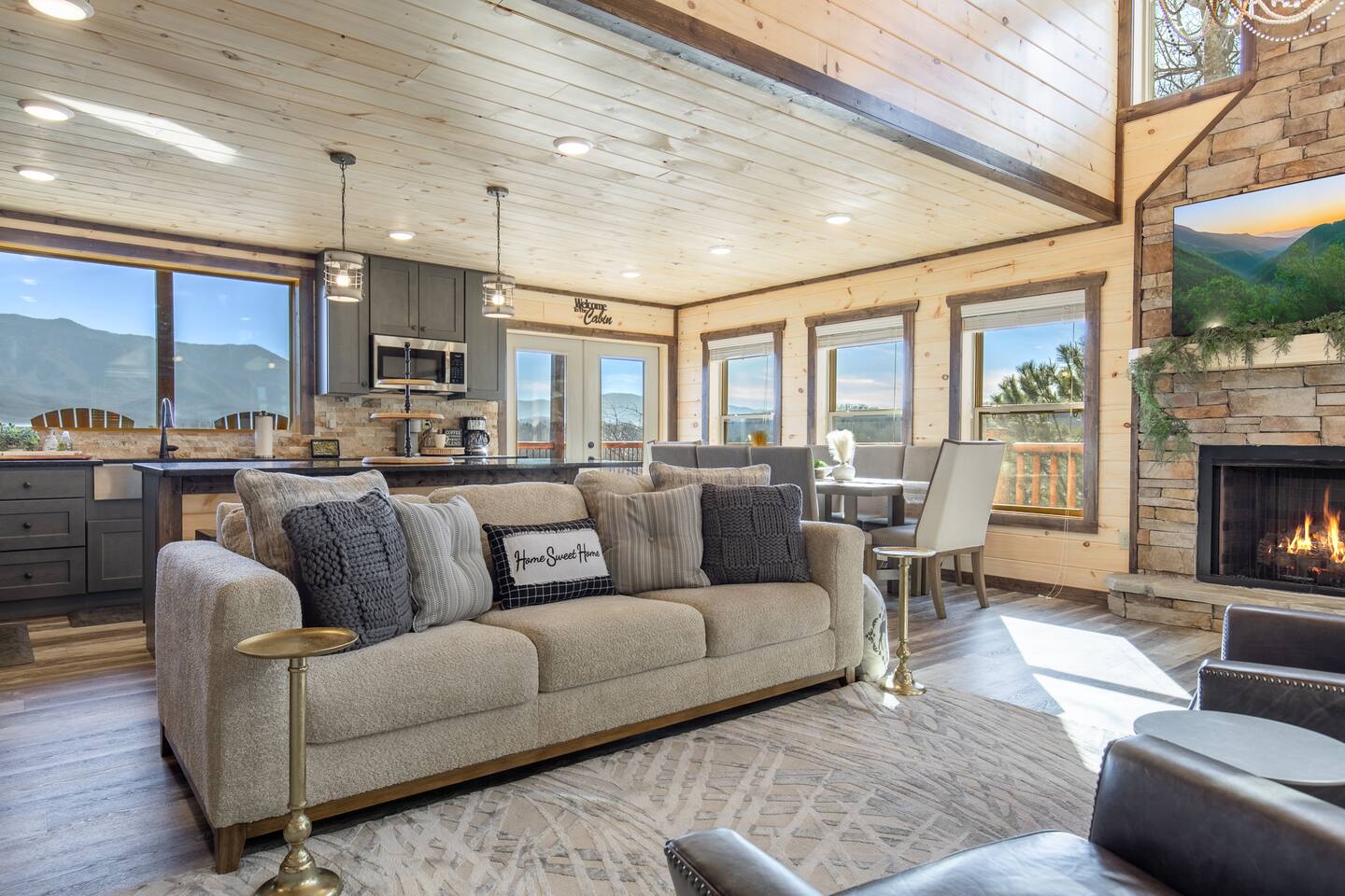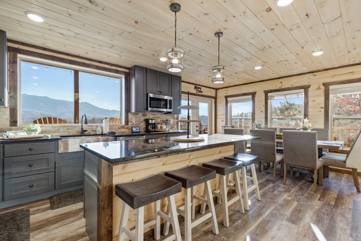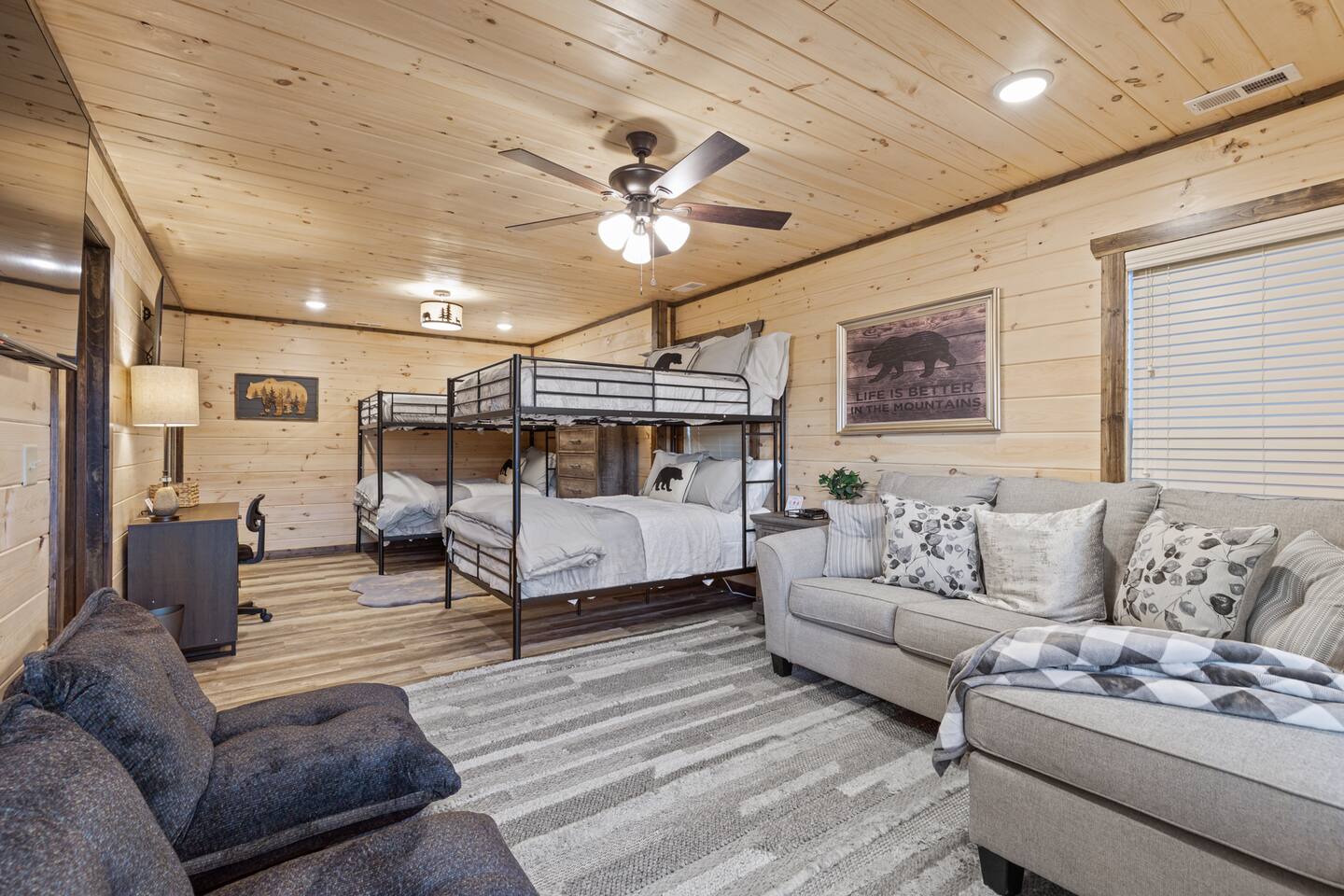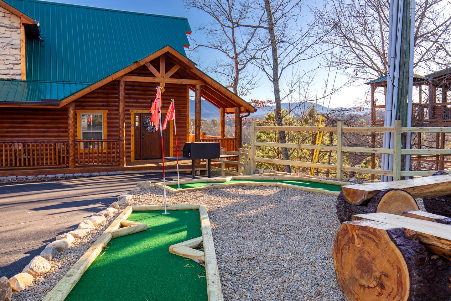 Come see why this is a guest favorite with all 5-star reviews! Nestled amidst the breathtaking Smoky Mountains, The Overlook at Settler's Ridge offers an unrivaled escape for your vacation needs. Embrace the allure of this newly constructed cabin, inaugurated in November 2023, boasting a panoramic view of Mt. LeConte and the picturesque surroundings. This retreat spans three levels and comprises four bedrooms, each accompanied by an exquisite en-suite bathroom. Elevate your stay with a fusion of cabin-chic aesthetics and opulent furnishings, meticulously curated to soothe your senses and elevate your experience. With its prime location mere miles from downtown Gatlinburg, and within moments of hiking trails, waterfalls, Pigeon Forge, and the allure of Dollywood, every convenience is at your fingertips. The main level's open floor plan fosters cherished moments for families and friends to forge lifelong memories. Bask in the serene mountain ambiance from the expansive decks adorned with Adirondack chairs and rockers, or savor intimate moments in the gazebo swing on the main level, tailored for couples seeking seclusion. Just added in January 2024 - an outdoor entertainment area with firepit and custom wood benches, 2 golf holes, and large grill for outdoor cooking! Discover comfort and luxury within the cabin's interiors, featuring a private king bedroom on the main floor, and two additional private king bedrooms on the upper level. The lower level beckons with a bunk room equipped with two sets of full over full bunk beds, complemented by an inviting seating area and a workstation for added convenience. Indulge in the cabin's amenities, including a heated indoor pool room and a rejuvenating hot tub on the lower deck, ideal for unwinding after a day of exploration. Entertainment options abound, with 58" 4K TVs in every bedroom, while the theater room hosts a stunning 75" 4K TV, replete with theater seating offering a sensory-rich experience. Beyond the cabin's splendor, its proximity to local attractions is unmatched. Only moments away from downtown Gatlinburg and nestled within easy reach of the Great Smoky Mountain National Park and Pigeon Forge, The Overlook at Settler's Ridge ensures you spend less time commuting and more time relishing the area's charm. Our commitment to cleanliness, luxurious accommodations, and top-notch customer service is unwavering. We strive to ensure that your stay at The Overlook at Settler's Ridge becomes an annual tradition, promising an unforgettable experience. Should you have any queries, please don't hesitate to contact us.