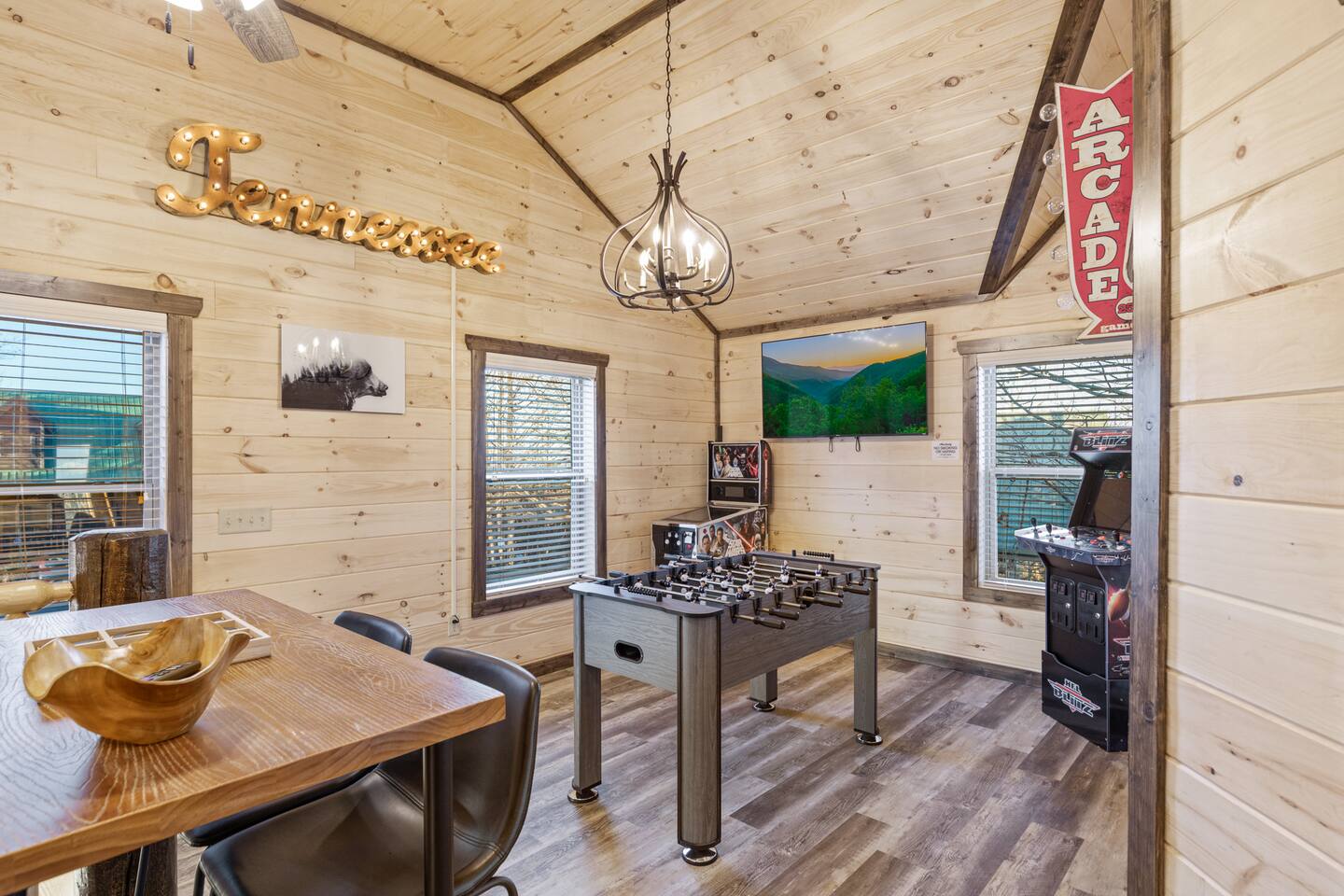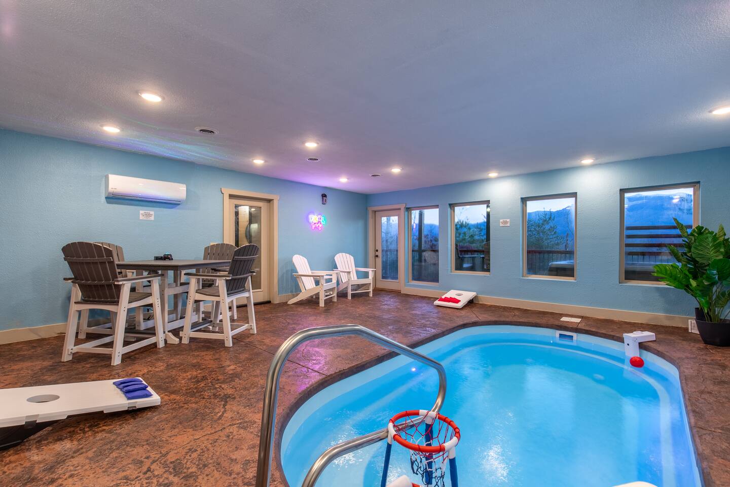 Escape to The Overlook at Settler's Ridge! This exceptional 4-bed, 4-bath cabin welcomes you with panoramic Mt. LeConte views, an inviting indoor pool, a relaxing hot tub, an entertaining arcade, and a deluxe theater room. Modern amenities complement its proximity to Gatlinburg & Pigeon Forge attractions, ensuring a convenient yet luxurious retreat. Bask in the comfort of the cozy decks, embrace the upscale comforts, and create timeless memories in the heart of the beautiful Smoky Mountains!